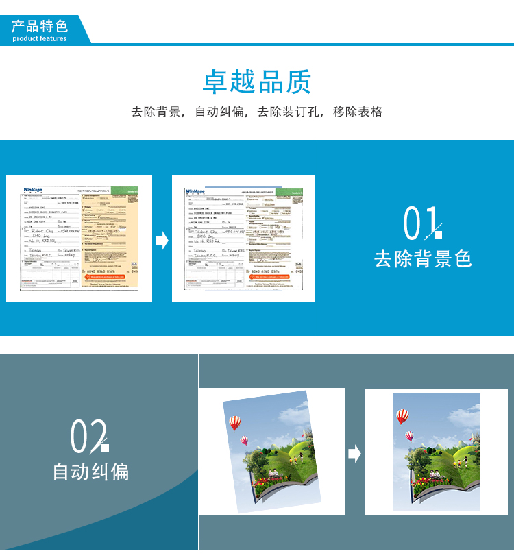 l TWAIN扫描驱动软件带有智能化处理的完美页面扫描功能,完成影像的歪斜校正、原稿尺寸裁剪、去底色、旋转、去白页、加框等功能。可同时得到扫描稿件的黑白、灰度、彩色三种影像输出。