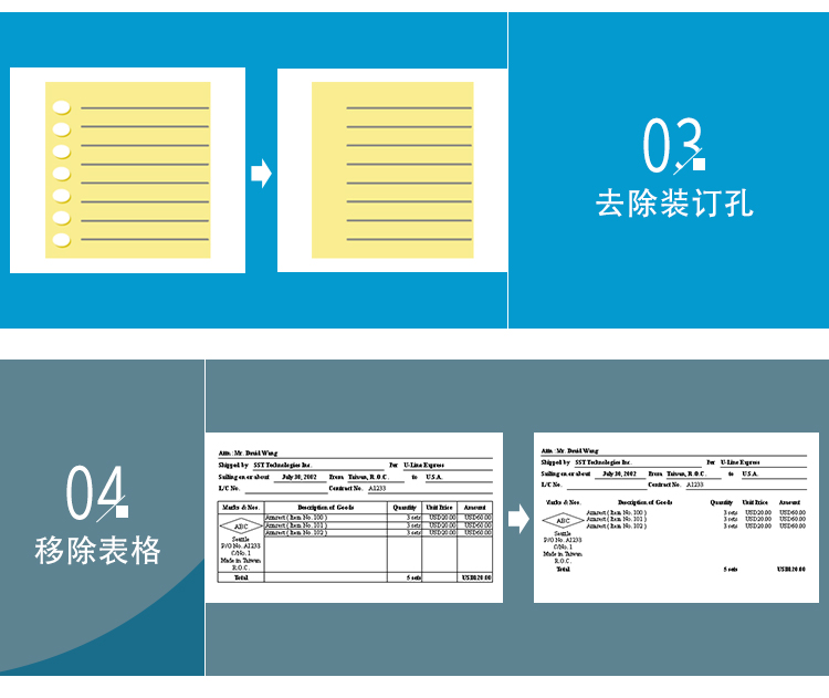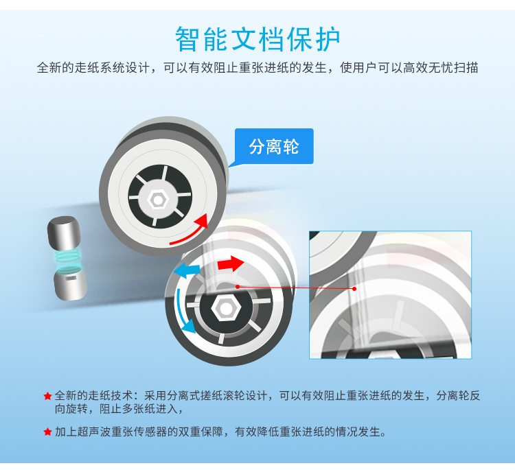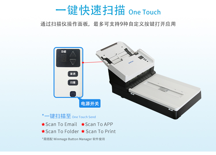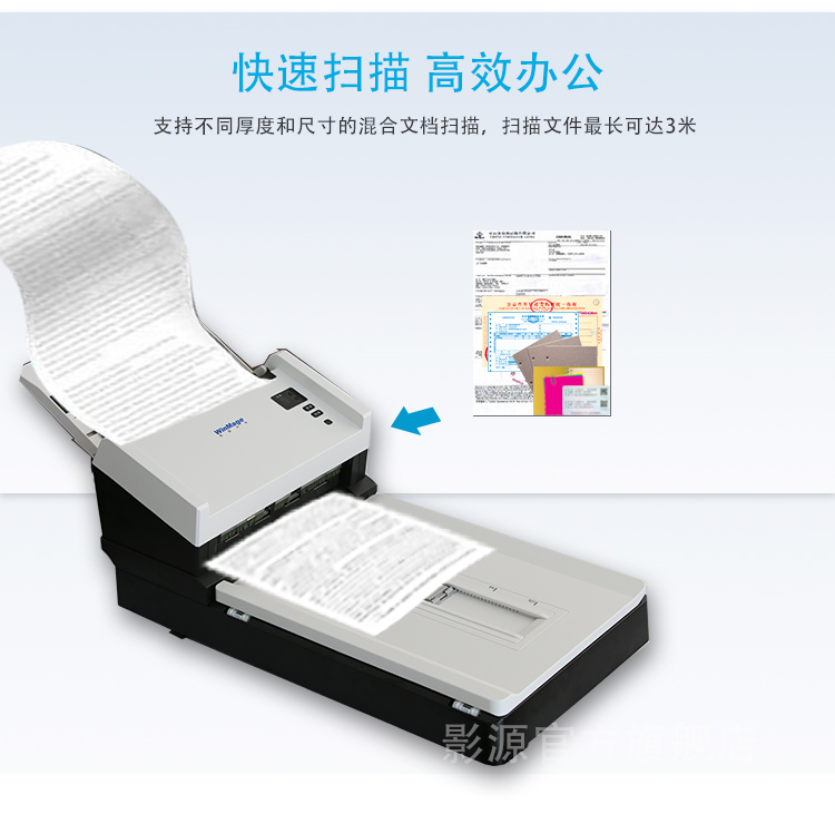 l 加宽A4幅面,具有不撕穿纸孔,即可以横向扫描发票等票据功能。