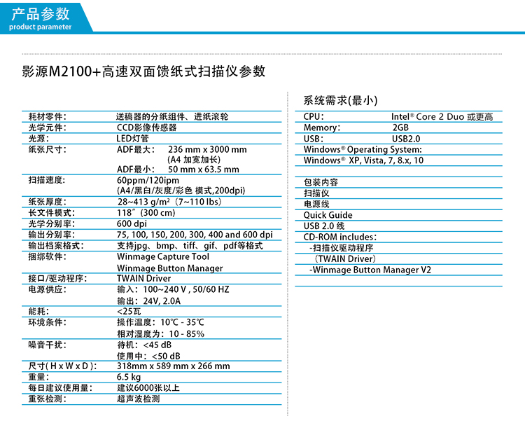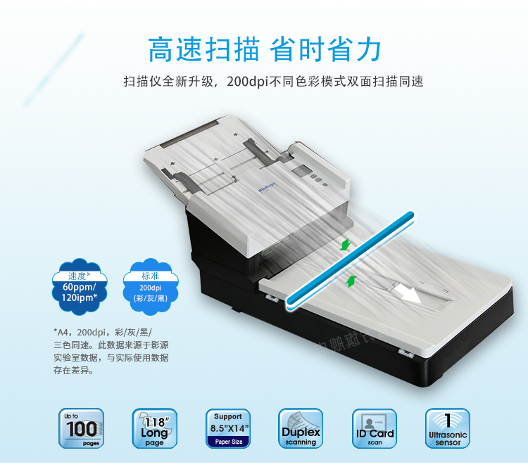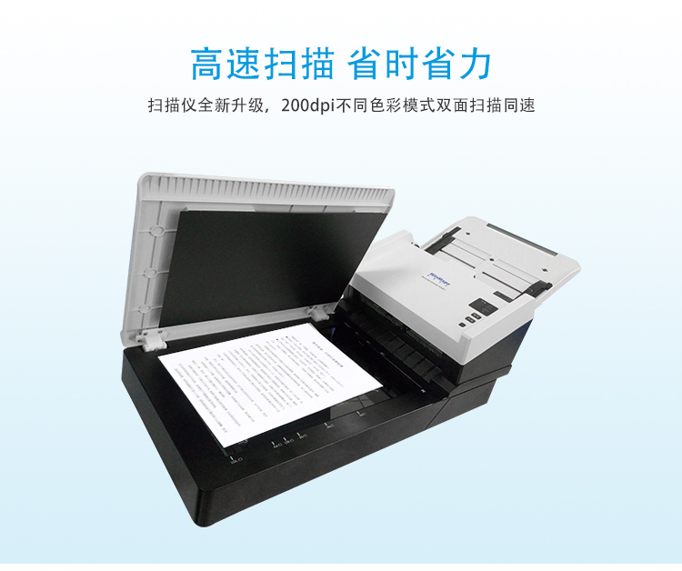 ¥719.00l A4双面彩色双平台扫描(ADF自动送稿扫描 + 平板扫描),ADF送稿器为直通式,稳定而平滑,通过性佳,适合票据扫描及海量文档扫描加工。A4、彩色/灰度模式、200dpi下扫描速度同速,可达每分钟60页/120面。