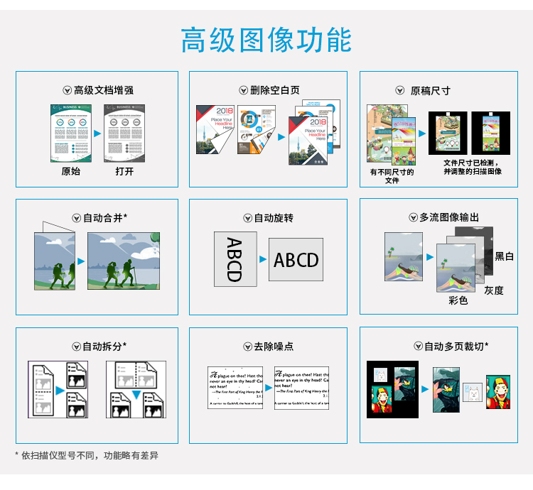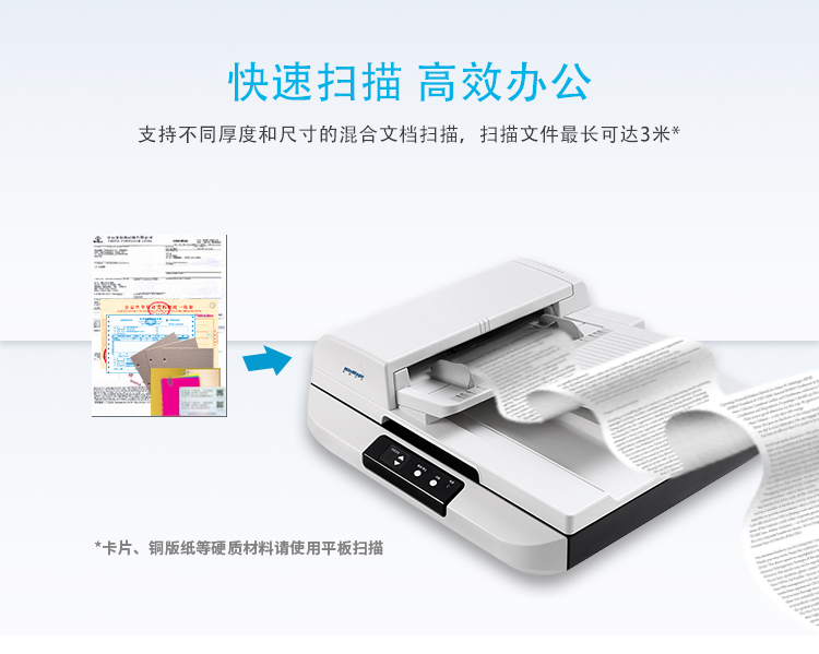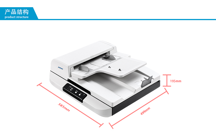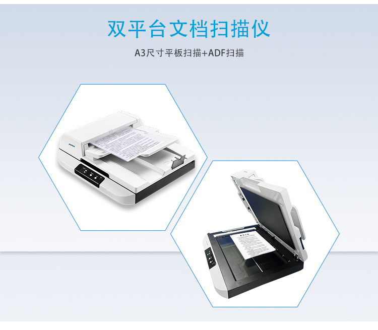 A3单面彩色双平台扫描(ADF自动送稿扫描 + 平板扫描),ADF送纸器U型通道,结构简洁且节省占地空间;